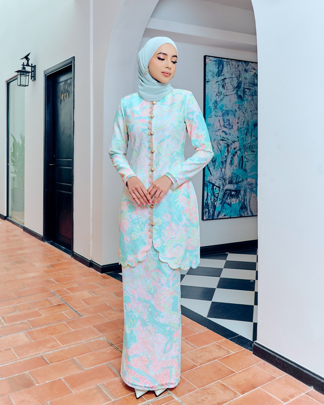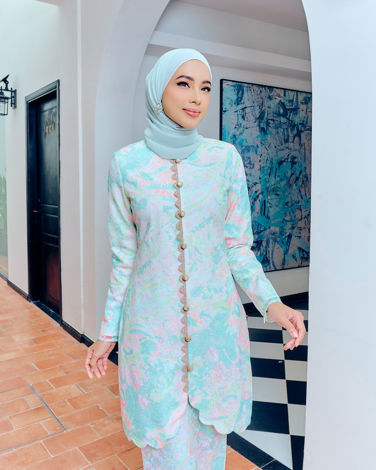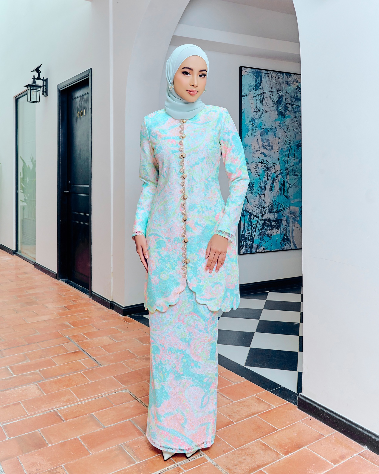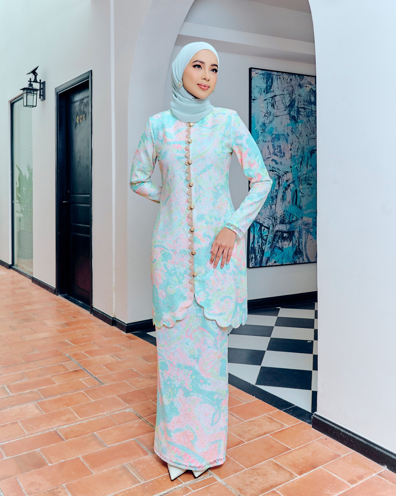 Model : 167 cm , 55kg. Bust 34 & Hip 36. Wearing Celestine Kurung in size XS (Example)
