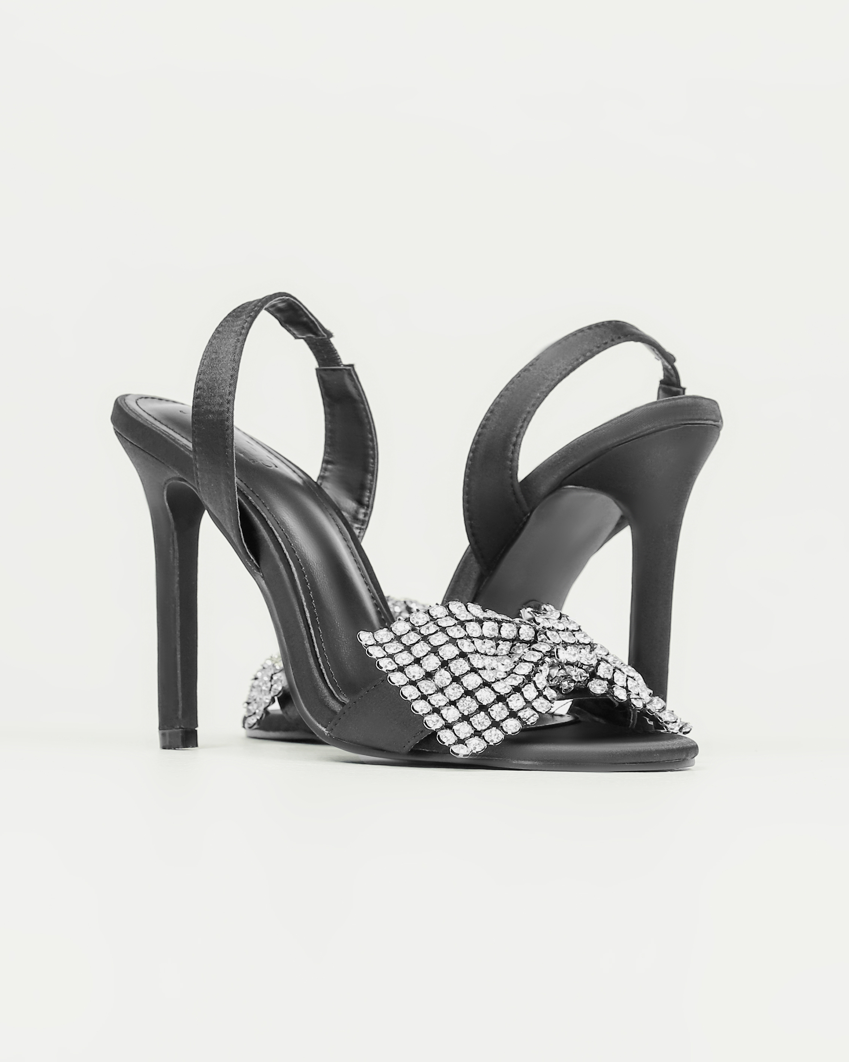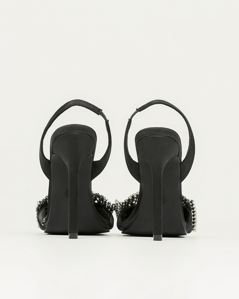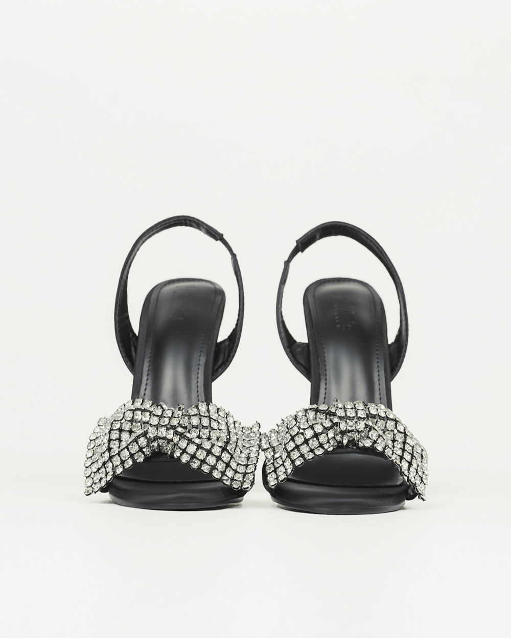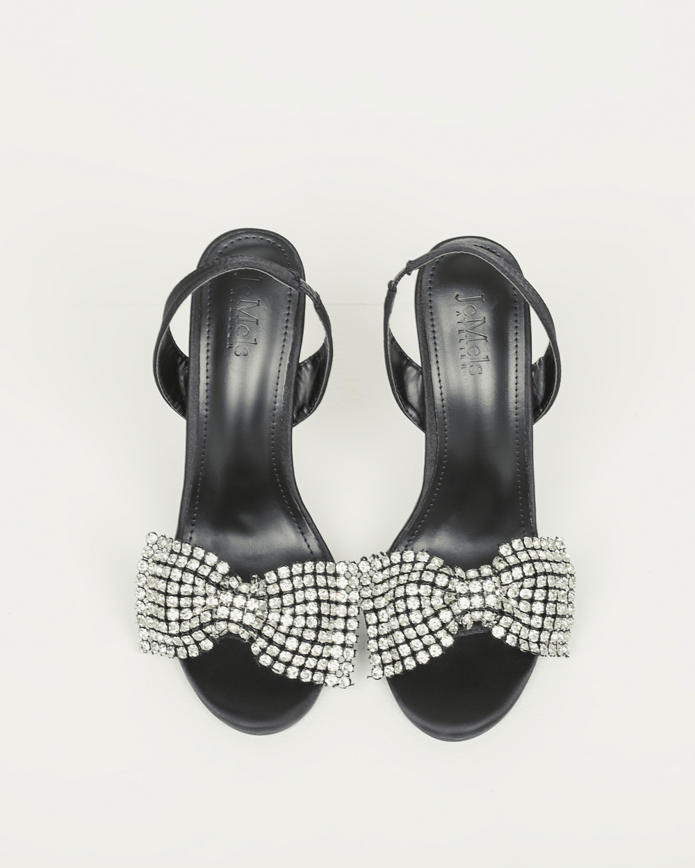 These metallic technical fabric sandals embellished with brilliant crystals play with typical themes and feminine details of the brand.