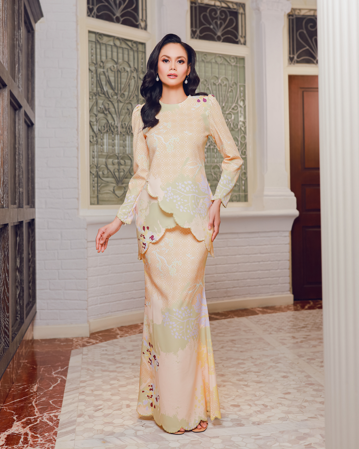Shima Kurung features a front split detail with Scallop Golden Embroidery matched with pastel printed design. Shima Kurung exudes Sweet & Classic Look for the wearer, interesting cutting to be chosen.