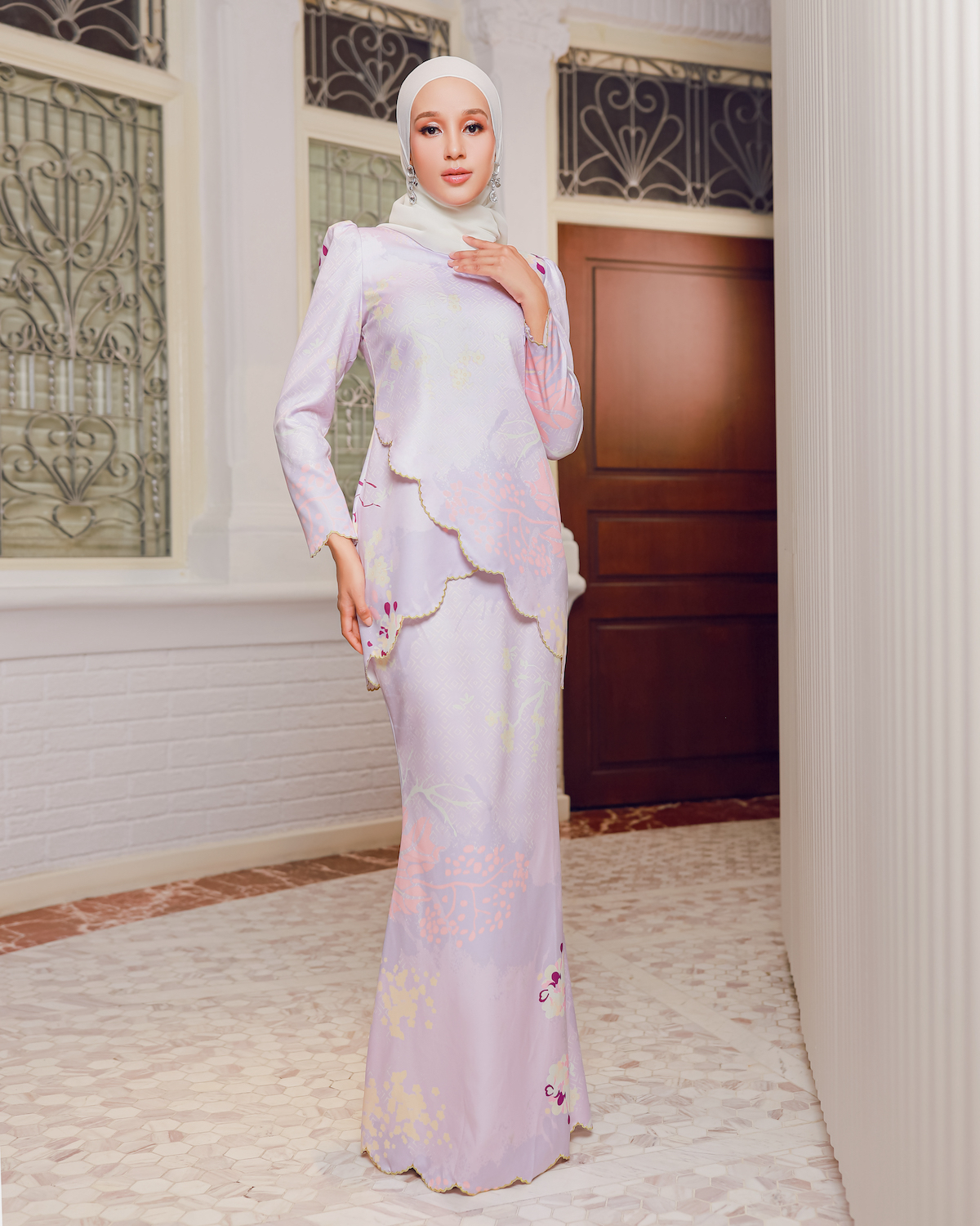 Shima Kurung features a front split detail with Scallop Golden Embroidery matched with pastel printed design. Shima Kurung exudes Sweet & Classic Look for the wearer, interesting cutting to be chosen.